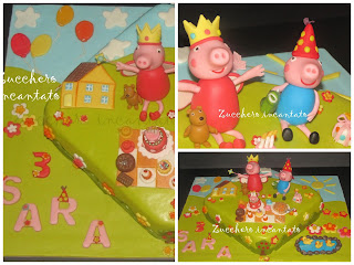 La mamma di Sara girando per il web ha trovato l'altra mia torta: Il picnic di Peppa Pig e se ne è innamorata. Quando mi ha contattata dicendomi che la sua bimba adora questa famigliola di porcellini ho deciso subito di accontentarla. Naturalmente quello che l'aveva più colpita erano le miniature!! Ed io le ho riproposte e questa volta di tanti dolcetti. Siccome io non amo ripetermi, e d'altra parte sarebbe impossibile visto che questi personaggi di zucchero sono un prodotto artigianale e quindi pezzi unici, ho creato una scenografia diversa immaginando un grande quadro dipinto sul vassoio e che proseguisse come un tutt'uno sulla torta. L'effetto finale mi ha soddisfatta totalmente, come pure il modelling dei personaggi! Stavolta la protagonista è Peppa pig principessa visto che la festeggiata è una femminuccia, una dolcissima bimba di nome Sara!