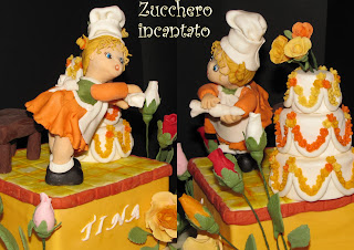 Ed eccomi qui a raccontarvi il mio compleanno, attraverso l'emozione  nel creare questo cake topper tutto per me !! Questa volta sono io la festeggiata e mi sono divertita un mondo a giocare con il mio zucchero incantato per rappresentare la mia grande passione per il cake design modellando me stessa nelle vesti di una pasticcera pasticciona che decora con la sac-a-poche una torta più grande di lei ^-^