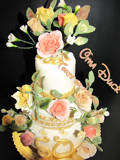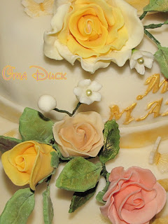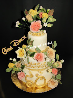 Questa torta l'ho preparata per una bellissima coppia longeva. I loro figli hanno organizzato a loro insaputa una bella cerimonia con la messa in chiesa e il ricevimento a seguire invitando gli amici di una vita e tutti i parenti. Erano molto emozionati dall'evento e li capisco, deve essere bello vedere i propri genitori trascorrere una vita insieme e poterli ricambiare con un bel gesto di tutto l'amore che hanno donato nel corso di questi lunghi anni! E poi diciamocelo onestamente, in quest'epoca in cui alcuni matrimoni non arrivano al compimento di un anno è proprio bello vedere una coppia che resta insieme tutta la vita... Immaginatevi come mi son sentita io nel realizzare questa torta che avrebbe rappresentato il momento clou della serata... Emozionata da morire...Mi sono dedicata animo e corpo nel curare scrupolosamente tutti i dettagli. Ogni singola rosa (ottenuta con tre sfumature di colore) è stata montata su un ferretto poi rivestito di nastro da fiorista. Le rose sono state realizzate petalo per petalo, affinandoli e rigirandoli uno ad uno, senza l'ausilio di stampini. Poi ho fatto il calice le cui punte sono state tagliate e assottigliate ad hoc e in più incise ai lati per renderlo il più vicino possibile all'originale. Infine ho apposto il "pallino" e le ho messe a seccare a testa in giù. Anche le foglie che ho sfumato con colori in polvere sono state montate su fil di ferro rivestito e aggiunte alle rose col nastro. Poi, non paga, ho aggiunto delle fresie bianche e, come da richiesta, le fedi i nomi il numero 50 e per non farmi mancare nulla, qualche farfallina. Ci ho lavorato per settimane, ma che soddisfazione vederla terminata!!!