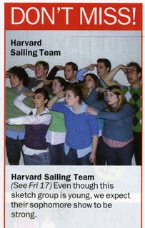 On Saturday night, we had a show in the city, which was awesome. I received a few special surprise treats that night, including, but not limited to, Clayton randomly singing the lyrics, "Raphael is cool but rude!" (from the Teenage Mutant Ninja Turtle cartoon theme song) during the Go Go Go sketch. Since I'm sure that sounds incredibly out of context, especially to those of you who've never seen the Harvard Sailing Team, let me assure you that nothing has been lost in this translation. It was completely out of context and I spit-laughed on Rebecca when he sang it. Lesson 1: The audience loves when the players laugh when they aren't supposed to. Lesson 2: Your friends will screw you over onstage. Lesson 3: Clayton's a punk.