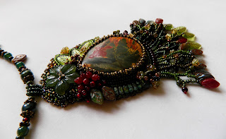 Прикрасу створила за мотивами схеми з журналу Beadwork. Мені було цікаво попрацювати з комбінованим плетінням - з бісеру та фігурних чеських намистин з двома отворами. Два види таких намистин якраз і використані у цьому комплекті - superduo (схожі на видовжені ромбики) та piggy bead (схожі на напівкуполи, а коли вони не у виробі, то подібні до п"ятачків маленьких свинок, звідки й така трохи смішна назва). Крім того, у центрі сережок і кулону - ще одні незвичні елементи: рідкісні двосторонні кришталеві ріволі, які сяють різними відтінками в залежності від освітлення. Тому й фотографій багато, бо намагаюся показати, як міняється сяйво кристалів. А завершують композицію скляні перлини різних розмірів, кришталеві краплі, скляні намистини і японський бісер. Коли завершила комплект, то приємною несподіванкою виявилось те, що прикраса може бути двосторонньою - зворотня сторона у неї теж гарна, це можна побачити на останньому фото