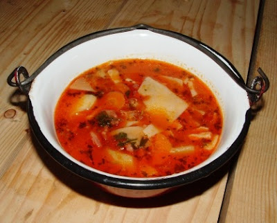 A hagymát kis kockákra vágjuk és kevés olajon vagy zsíron egy lábosban megfonnyasztjuk. Ezután hozzáadjuk a kis kockákra vágott császárszalonnát és enyhén megpirítjuk. Beletesszük a kolbászkarikákat is és kb. fél percig kis lángon még tovább pirítjuk, hogy a kolbász is enyhén kiengedje a zsírját. Miután ezzel készen vagyunk, félrehúzzuk a lábost és belekeverjük a pirospapikát, zúzott fokhagymát, majd felengedjük 2 liter vízzel vagy húslével. Ízlés szerint sózzuk, borsozzuk. Hozzáadjuk a karikákra vágott sárgarépát és a kockákra vágott burgonyát. Beletesszük a babérlevelet és félpuhára főzzük a hozzávalókat.