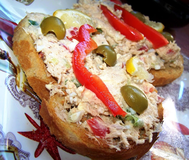 - Egy keverőtálban összekeverjük a tonhalat, tojást, hagymát, paprikát, mustárt, tejfölt, puha vajat. Sózzuk, ízlés szerint borsozzuk, frissen facsart citromlével bolondítjuk.