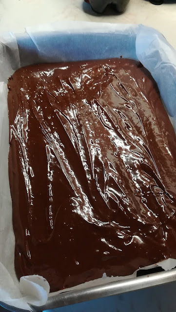 - Egy 20x30-as tepsit kibélelünk sütőpapírral, (az enyém pár centivel nagyobb) beleöntjük a masszát és simára egyengetjük.