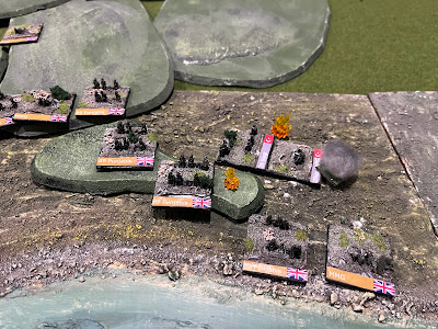 As I suspected, the limitation to the attackers' ability to get off the beach created by the rules addition that requires an HQ to sit on the beach until it rolls a successful order change, the normal existence of a command radius for all units pert the standard rules, and the impact on movement of crossing contours coupled with the complexity of the terrain with ridges and valleys, has a profound impact on the attack. That is the intention. I initially sat thinking I'd shoot it out in a firefight with the few defenders, and then being conscious of the impending arrival of Turkish reinforcements, decided to rush forward and grab as much high ground as I could, meant the attack became disorganised.
