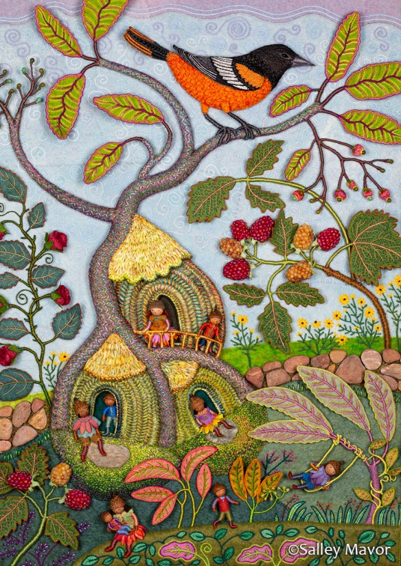 I hope that you’ve enjoyed learning about the making of Summertime. For a more comprehensive understanding of my process, I encourage you to explore previous posts in this series: Overview of the piece, Part 1 – Tree Trunks, Part 2 – Tree Houses, Part 3 – leaves, stems and branches, Part 4 – Baltimore Oriole (body), Part 5 – Baltimore Oriole (head and feet), Part 6 – rose vine, Part 7 – raspberry plants, Part 8 – stitching flora, and Part 9 – moss, sky and stone wall.