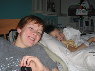 Connor is making great progress. Sunday, they took him off his morphine pump and took out his iv's, but they kept his port accessed. He started receiving Pediasure in his feeding tube, also. Yesterday, he got his ng (nose) tube out, he started drinking liquids and he had a bowel movement. Everything seems to be working well as far as his digestive system goes. He has been up walking around a lot, and he played video games in the play room. Today, they should take out the drainage tube, and he can start drinking more complex liquids like smoothies, soup, etc. If things continue to progress well, he will be released Thursday morning! Yeah! Praise God! We are ready to skip on out of here. Although we have enjoyed visits from family and friends in the hospital, there's no place like home.