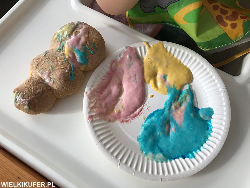 Nałożyłam sobie 2 wytyczne a propos tych farb. Po pierwsze musiały być proste w wykonaniu i jedynie z tego co mam w domu, a po drugie musiały być bezpieczne dla dziecka i jak najbardziej naturalne, to tak na wypadek gdyby dziecko miało ją niechcący zjeść.