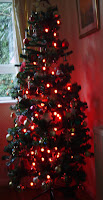 This Morning burbling in the background (it's traditional for me, okay??) and slung some new eco-friendly, red berry LED lights, which I bought a while back, round its many branches, before attaching all the baubles and trinkets garnered over the years - thankfully