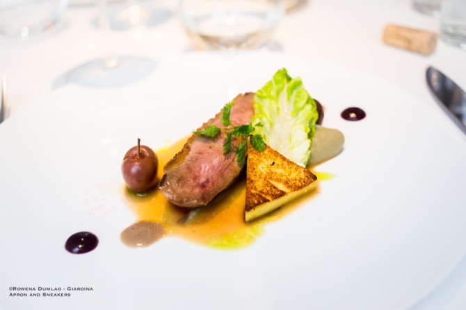 (Roasted duck fillet, artichoke mousseline, pickled cherry and anchovy condiment, rosemary infused juice)
