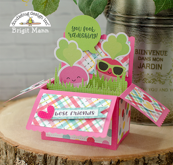 I used a box card die to create this card and added the little radishes from the odds & ends pack. The little hearts on the sides are also from the pack and the heart on the best friend sticker is from the hearts sprinkle shapes pack. Paper is from the so punny 12 x 12 collection and limeade gingham-linen petite print.