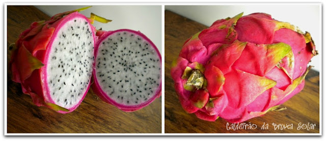 Nunca havia provado a Pitaya, essa fruta bem diferente e bonita de origem asiática também conhecida como "fruta do dragão" e que me chamou a atenção pelo seu desenho tanto por dentro quanto por fora. Tem uma sabor sutil, bem suculenta, algo ente kiwi e lichia. Imagino que deva ficar gostosa também em sucos.