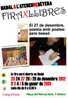 Tercer any consecutiu que organitzem una fira de llibres espectacular a l'Atenu de Bétera. Autors, il·lustradors, músics, poetes, i cienma. Perquè enguany el paquet porta incoorporat el cinema compromés per al debat. Obrim un grapat de dies i tindreu l'oportunitat de triar un bin regal en aquests nadals de retallades i empenyoraments socials. La vostra fira és a la plaça del Mercat núm. 5 de Bétera. ORGANITZA INSTITUT D'ESTUDIS COMARCALS, CONSOLAT DE MAR, ATENEU DE BÉTERA I ESCOLA GAVINA