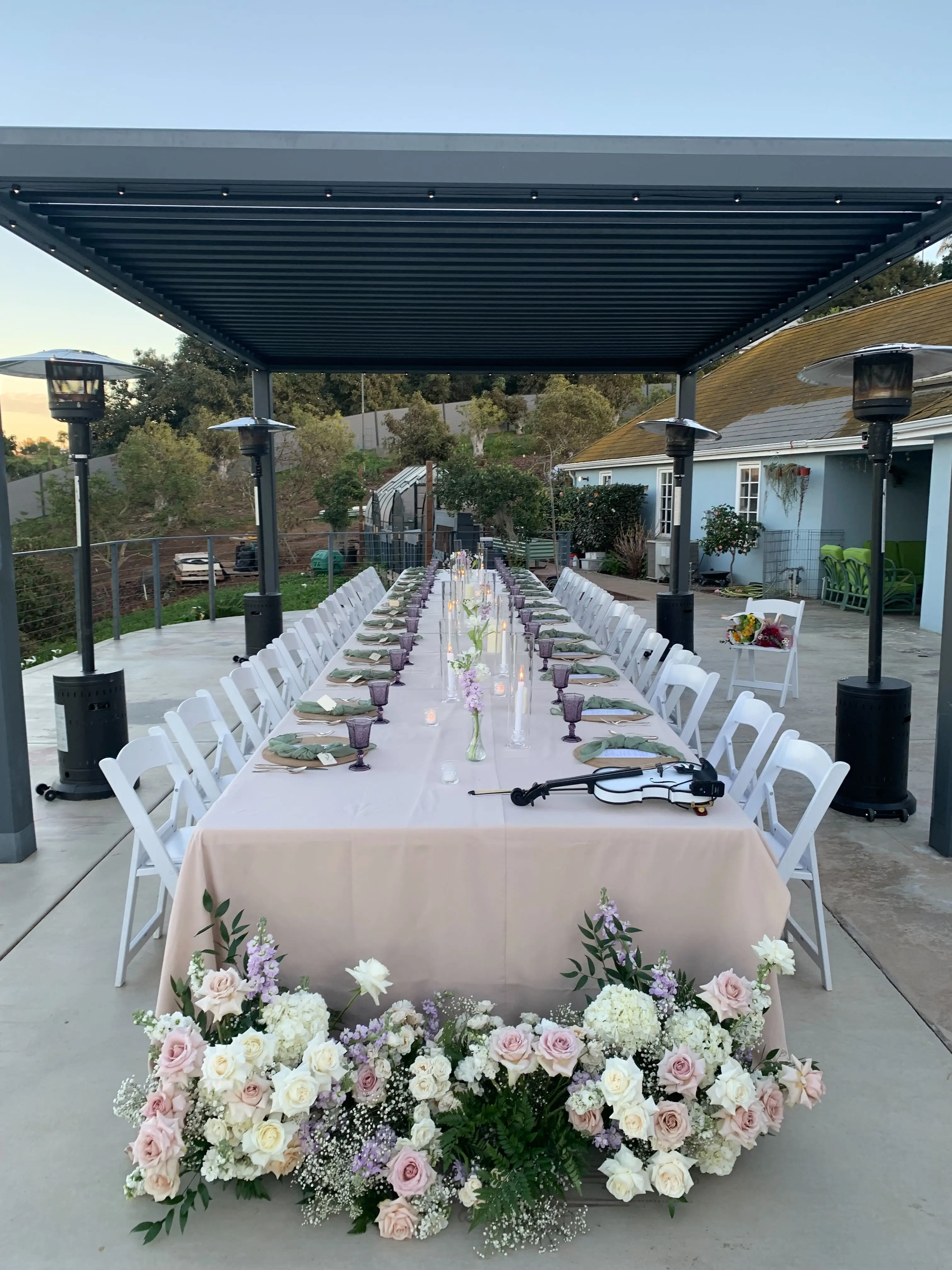 Guests enjoy a golden-hour celebration in Southern California, surrounded by elegant florals and warm conversation. A joyful outdoor gathering beautifully catered by Chef Joann.