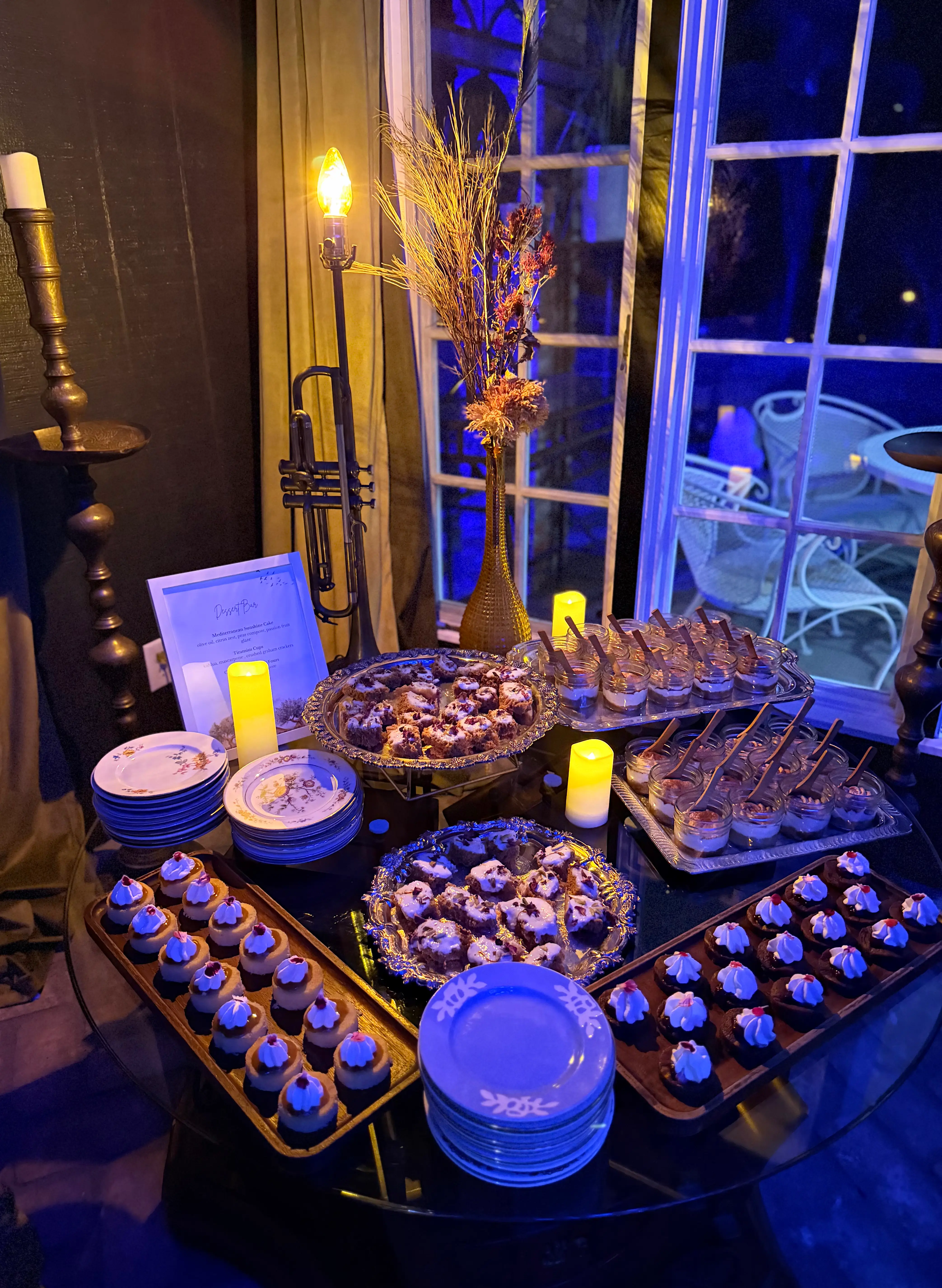 Grand Marnier dessert cakes displayed under glass cloches at Chef Joann Catering’s red-draped luxury dinner event.