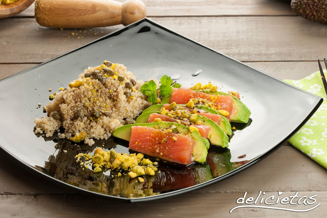 - Para montar el plato, colocamos la quinoa a la que agregamos unas cuantas alcaparras, que combinan fenomenal con el salmón y el aguacate. Colocamos las láminas de salmón y aguacate de forma alterna. Echamos un poco de pimienta negra recién molida sobre nuestros ingredientes.