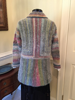 The construction is based on an idea sparked by Carol Anderson’s “Babies and Bears for Grownups” jacket, a design which I loved making, but which never quite worked for me in terms of fit or style. I’ve taken the same basic concept, starting at the cuffs and knitting toward the centre, but I’ve made the arms slimmer, changed the neckline to a flattering V-neck with a graceful shawl collar, and added shape to the body by knitting down after the centre-back join to create a short peplum. Great fun to knit; just as much fun to wear!