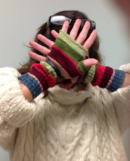 Long fingerless mitts for the cold sunny days in the Colorado Rockies or for walking the dog on the streets of Manhattan. These colourful striped mitts will take you anywhere! Wear them long to warm your wrists and arms or slouch them for a pop of colour at your jacket cuff.