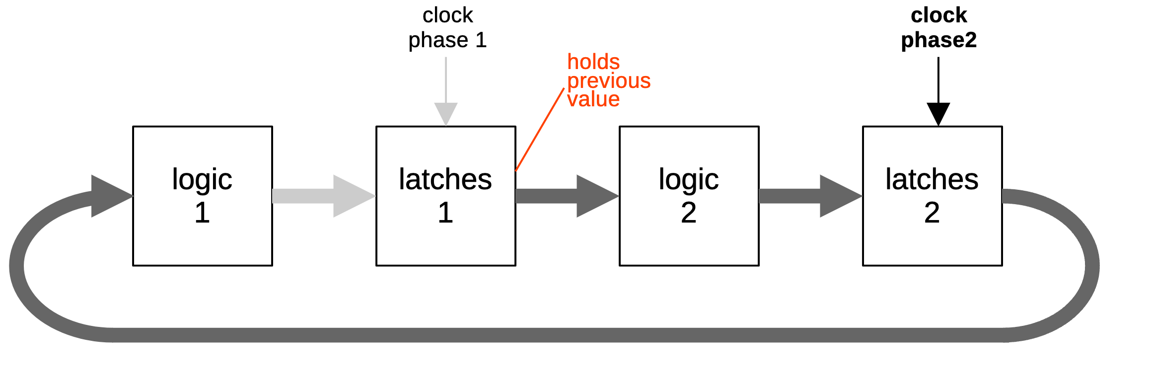 During clock phase 2 (below), the first block of latches stops passing data through and holds the previous values. Meanwhile, the second block of latches passes its data through. Thus, the first logic block receives new values and performs logic operations on them. When the clock switches to phase 1, processing continues as in the first diagram. The point of this is that processing takes place under the control of the clock, with values passed step-by-step between the two logic blocks.1