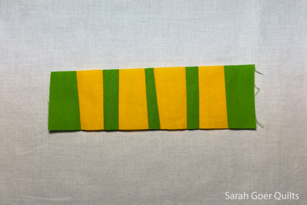 For the second block I took inspiration from my round robin unit. I created a large wonky strip set wide enough to be trimmed on the diagonal to be the center section of my second block.