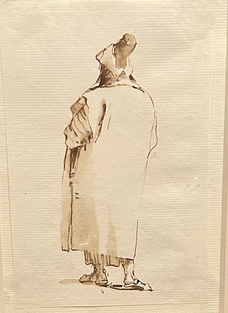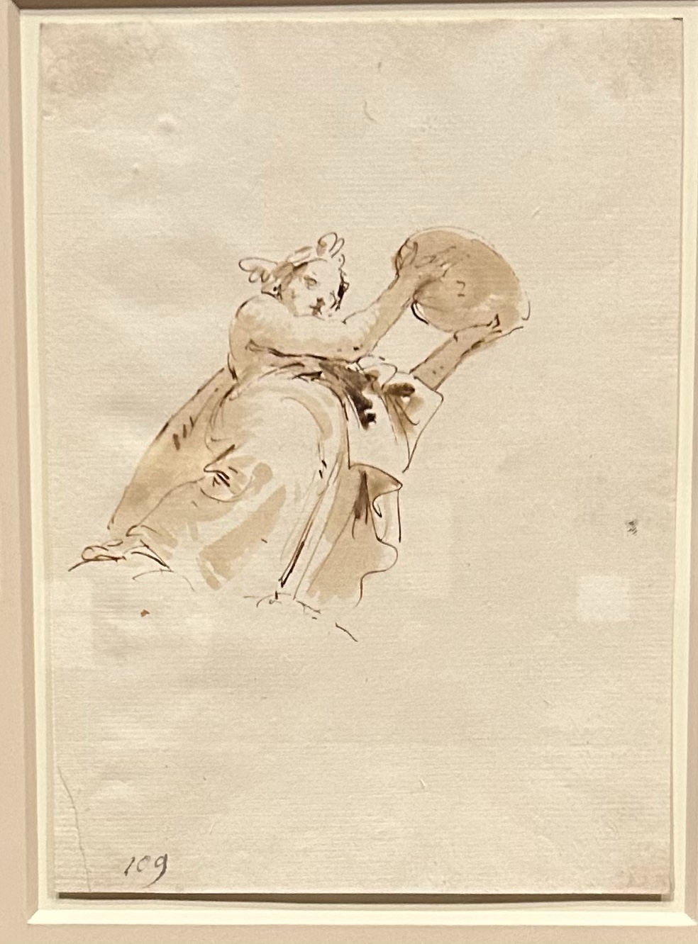 Used Burnt Sienna and Titanium White. Study looks labored and amateurish. Figure and draped settee not modeled very well. Just ran out of time and not adept at working “alla prima” yet. Used too much white. Would have been a better sketch if I had thinned the paint and wiped away the pigment with a towel to achieve the light effects on the figure and background and minimized the use of white.