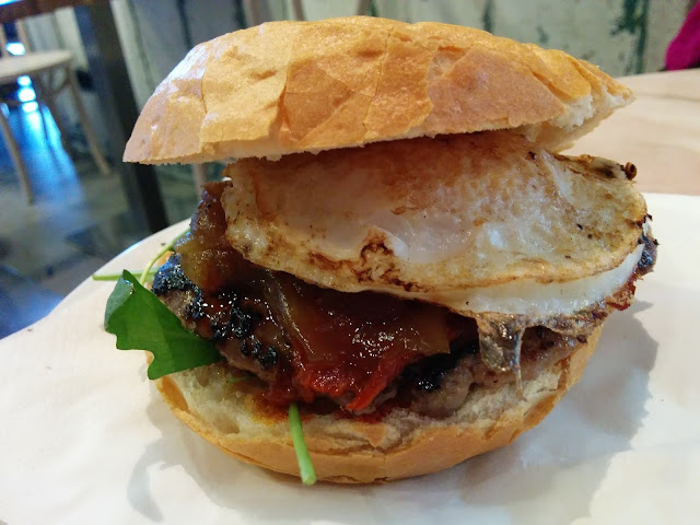 El local és desenfadat, quan entres vas a la cua i mentre vas mirant a la pissarra les varietats d'hamburgueses que tenen. N'hi ha de vedella, xai, pollastre i fins i tot vegetarianes.