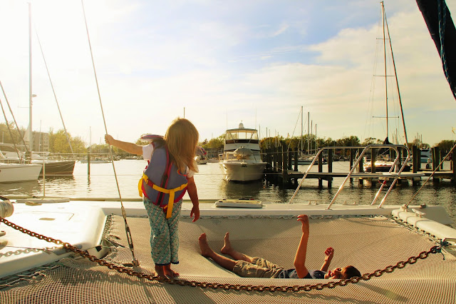 The new evening entertainment is just hanging out on the foredeck. Swinging, jumping, spoiling the dog, tackling, giggling, reading, playing ukulele, anything as long as it's out in the fresh fabulous spring air. We're savoring each sunset. Sometimes we blow the conch horn. Other times we snap a dozen photos, and still other times we just stare silently in gratitude for another beautiful day.