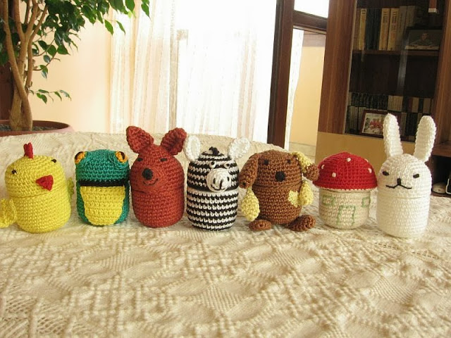 cu un set de animalute crosetate pe cutii de la oua Kinder