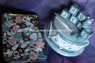 ...ed ecco la Tamburino cake!!!!! Come da richiesta di mamma Elena, che si è innamorata della celebre torta realizzata dalla cake designer Karen Taylor, celebrata nel suo libro "Drummer Boy", ho realizzato una "copia" della torta di battesimo della cake designer!!!! Ovviamente ho apportato un'unica modifica: ho realizzato 6 cubi che andassero a comporre il nome del piccolo Jacopo, per il resto abbiamo mantenuto tutto fedele, compresa la tonalità!!!! Vi devo confessare che è stata una bella sfida, avevo paura di non essere all'altezza, insomma parliamo di una torta di Karen Taylor!!!! Tutto sommato però, credo di aver superato la prova, mamma e papà sono stati soddisfatti della torta e speriamo sia anche piaciuta????!!!!! Infine ad accompagnare la cake ho realizzato anche dei biscottini baby!!! Ora non vi annoio più e vi lascio alle foto ciao ciao!!!!!!