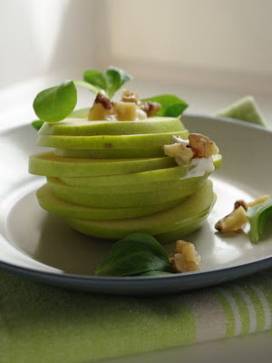 Vékonyan felszeletelt, magházától megszabadított almaszeletek, citromos-majonézes öntettel, dióval és madársaláta levelekkel. Mindössze ennyi került a tányérra.