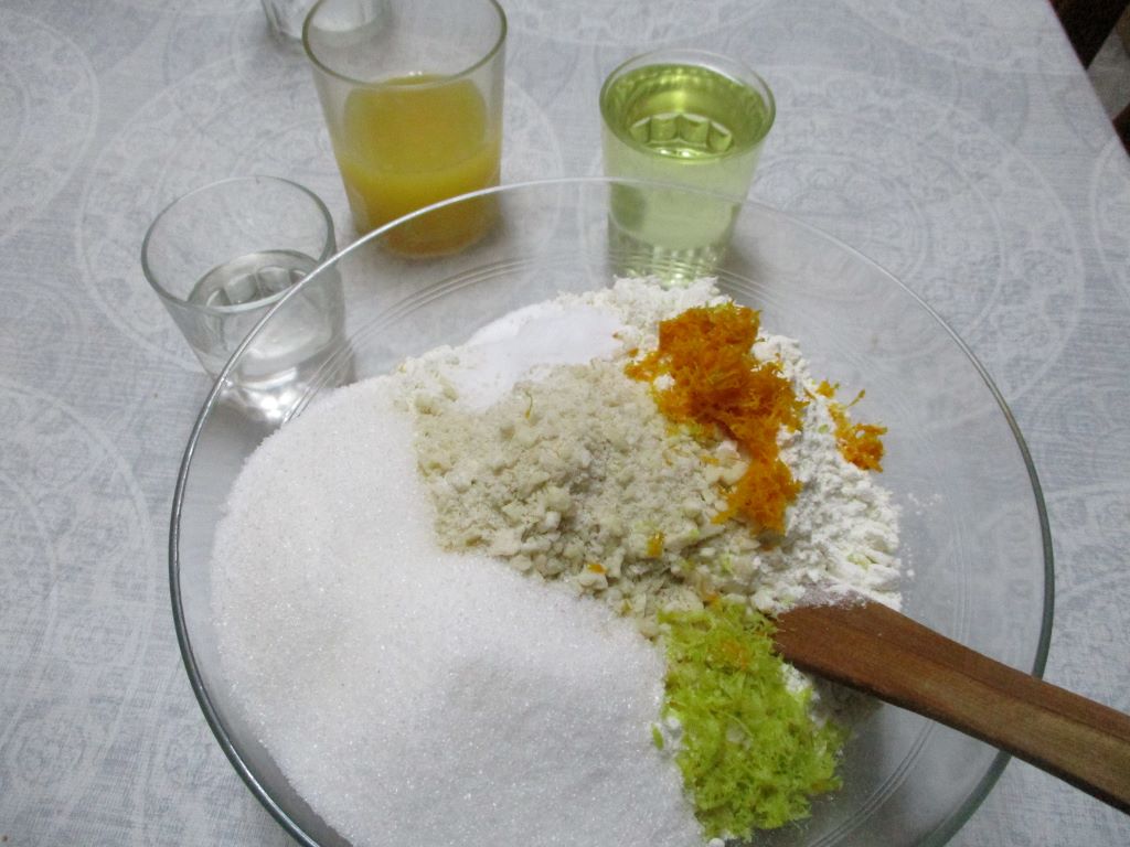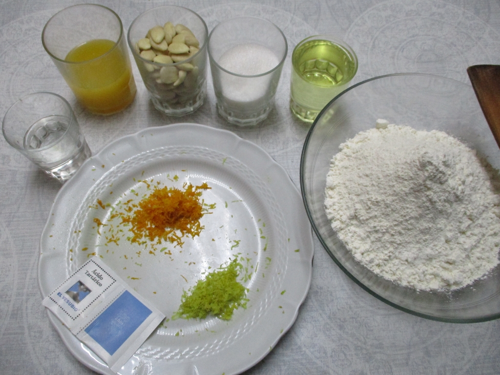 Mezclar en un bol la harina con el azúcar, la almendra, la ralladura y el polvito de las gaseosas.