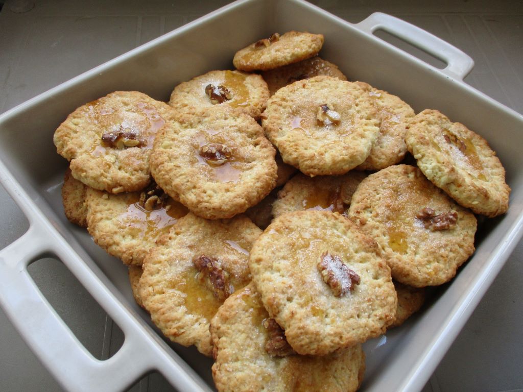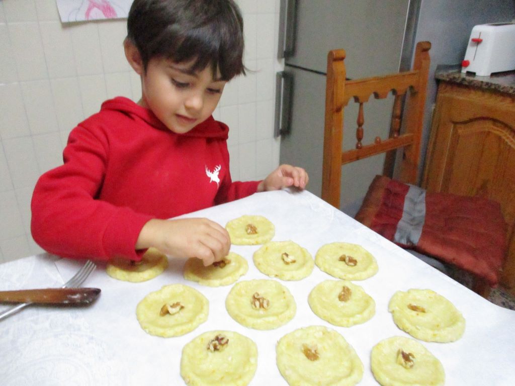 Formar bolas de unos 30/ 35 gr. luego las aplastamos y le damos forma, nos podemos ayudar de un tenedor. Las vamos colocando sobre papel de horno en la bandeja, decorar con un trozo de nuez en el centro y espolvorear con un poco de azúcar.