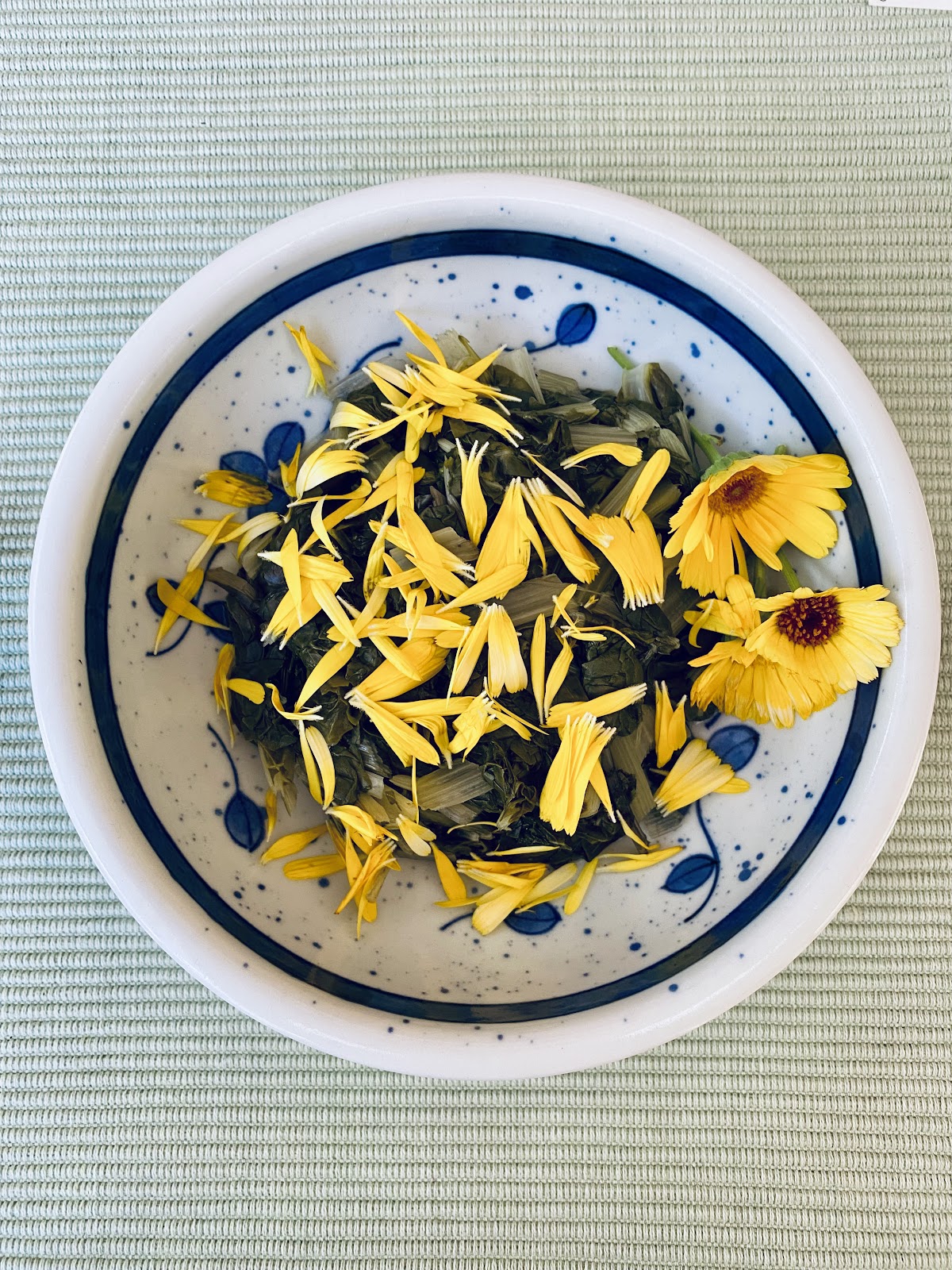 This is what abounds in my garden right now! Wash well, especially the silverbeet (I soak it in water about seven times). Cook the silverbeet in a little salted water, then drain and squeeze. Let it cool down and chop. Place into a serving bowl and add half of the calendula petals. Dress with olive oil, salt and white wine vinegar. Top with the rest of the calendula petals. Easy and delicious.