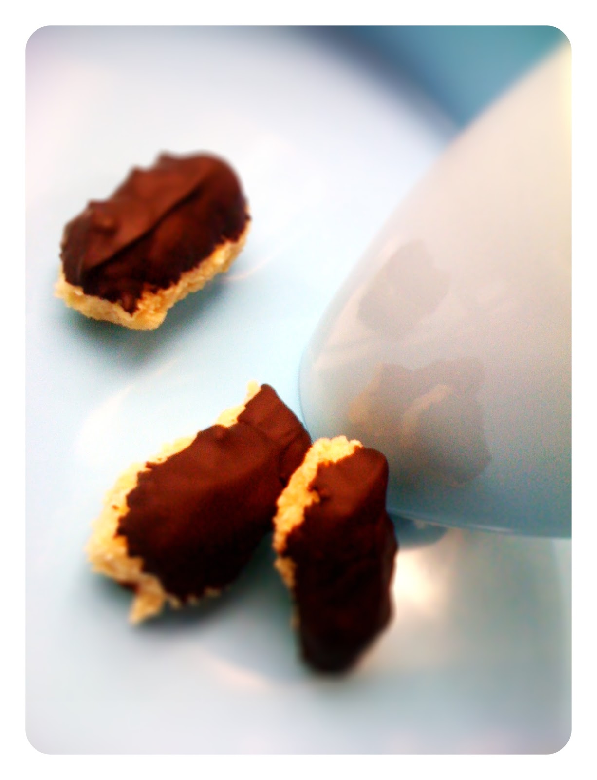 To finished I melted some dark chocolate (72%) and dipped one side of the biscuits into it. Once the chocolate had set the 'fingers' were ready. Perfect for tea and coffee, and very high in protein!