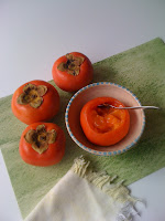 I have fond memories of eating cachi (Italian for persimmons) as a child in Italy. Ahhhh delicious sweet cachi, from October to December, always so soft that they were bought in trays from the fruit vendors, and then Mum would put them in a bowl, give us a spoon, and let us enjoy the runny soft flesh. Then at 19 I went to live in the UK, and for 6 years I had no persimmons, with one exception. To be honest I could not believe how little fruit they had in the UK (back then), every house I went in seemed to have only three types of fruit: oranges, green apples and bananas. Berries and stone fruit were luxuries and mostly used canned, or to top desserts. There was exotic fruit but mainly in fruit baskets given as presents (with the exception of the previously mentioned bananas, and the occasional pineapple). Persimmons were probably considered exotic too, although things may be different now. During those six year the only time I saw them was when a friend, married to a Japanese lady and with a catering business (so he knew where to get unusual fruit) offered me some. I didn't even know the English name, but I discovered that the Italian name cachi sounds like the Japanese name Kaki. And then I was surprised to see that the kaki where hard, not soft, and cut into slices and peeled.