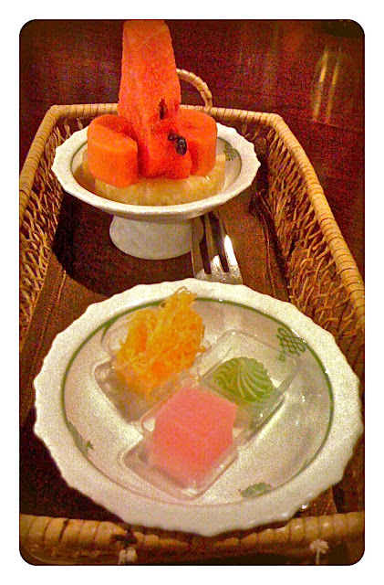 Dessert was fresh fruit and traditional Thai sweets. The pink one is Woon Krob, or crispy gelatin (a paradox!) I tasted it but then wasn't sure if it was made with agar agar or not so I left it there. The green one tasted dry and floury and I had not idea of what it was and then I found it