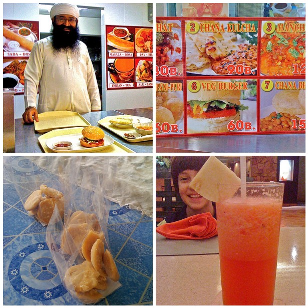 We had 3 more Thai meals in another of the hotel's restaurants, where they did have a vegetarian menu, but they offered just more spring rolls, fried noodles and fried rice (with eggs) so it got a bit tiring, but as we were sight-seeing most of the time, we were generally too tired to go and look for interesting eateries, and a couple of times we stayed put just to avoid torrential rain. For a break we had Indian, as we found a really nice Indian 100% vegetarian stall in the food court near the hotel (they even had veggie burgers, Indian style!). We ate there twice, and one evening we went to a nice Indian restaurant for a big meal of all the kids' favourite curries and naan bread. It may seem strange to have Indian food in Thailand, but it was easy with the kids who could even order the food by themselves: all Indian caterers spoke English (even in the food court, where most other locals didn't, once I ordered a green curry in the Thai Vegetarian stall and I got... fried noodles!). Of course there is more vegetarian food available, I remember this from when I first visited many years ago, but at that time we travelled there for a few weeks, we didn't have kids, we were young and more adventurous about street food or small hut restaurants by the beach. For mainstream eateries it may be difficult because fish sauce seems to be averywhere, even in salads. When we visited Ayutthaya (I will write about it later, wonderful place!) we discovered that the area is mostly patronized by Japanese tourists, and we ended up eating from a buffet where the chef informed us that all the food had fish sauce except for the.. vegetarian sushi and vegetable tempura! So lucky that the kids love Japanese food too!