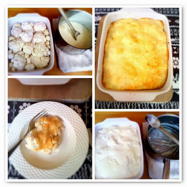 For the sauce (Besciamella) melt 100 g of salted butter in a saucepan, then add 100 g of plain flour and stir. Add 1 l of milk slowly, stirring constantly without making lumps, then simmer until the sauce thickens. At the end add freshly grated nutmeg, white pepper, and salt to taste. Spread a little sauce in the bottom of a oven dish, then arrange the cauliflower florets on top. Cover with the rest of the sauce, banging the dish so that there are no air bubbles. Sprinkle with 100 g of freshly grated parmesan cheese and place in the hot oven for about 40 minutes, or until the top is golden. Serve hot. Easy!