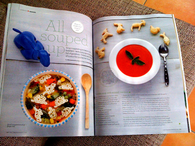 Dino is happy! We were shooting my dinosaur minestrone and I just thought that it would be nice to have a 'model'. I went up to Max's room and picked up Dino, who has been in our family since Max was a baby (11 years), just to see how he looked! Well, I think that Dino is exceptionally cute and well kept too for an 11 years old soft toy! And guess what: he made it, he is in this issue of Little Treasures Magazine, and I can assure you that both him and Max are over the moon about it!