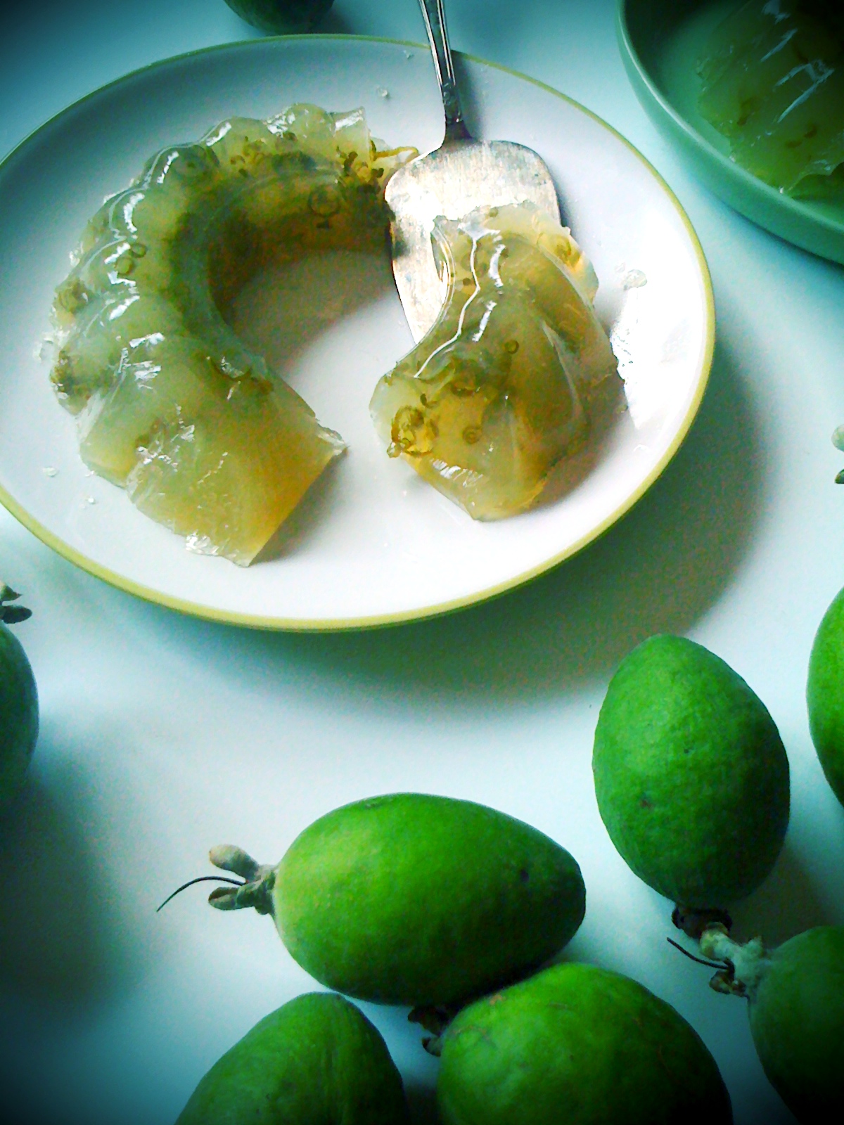 Cut the feijoas in two halves and remove the flesh with a teaspoon. Set aside. Beat the eggs and sugar first until the mixture is pale yellow, then add the butter and, little by little the flour. End with vanilla. Stop beating and fold in the feijoas. Pour into a greased or lined baking tin (20cm is good) and bake at 180℃ for about 45 mins (until a toothpick inserted into the centre of the cake comes out clean). Tip upside-down on a serving plate while still hot, the feijoas tend to go to the bottom so I keep the cake upside down to have them at the top. Dust with icing sugar and let it cool down completely before serving (so that the base of the cake will flatten nicely). Yum with cream or mascarpone!