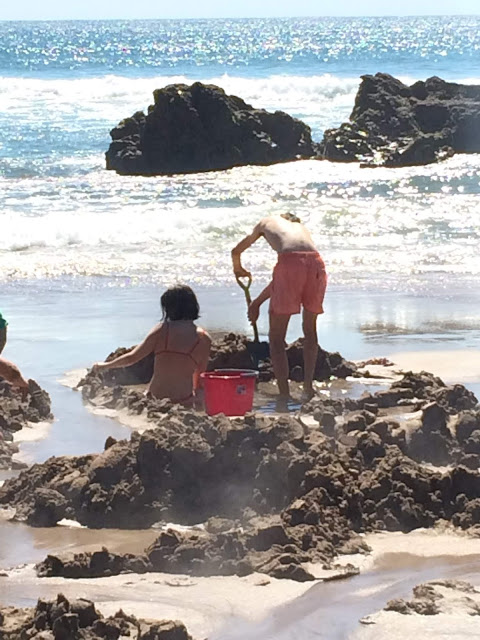 Avevamo la nostra pala (si possono anche affittare) ed i ragazzi si sono messi al lavoro con entusiasmo! Chi è pigro può trovarsi un posto già scavato, infatti l'acqua diventa così calda che non tutti rimangono nei loro buchi, alla fine ne abbiamo scavati 3!