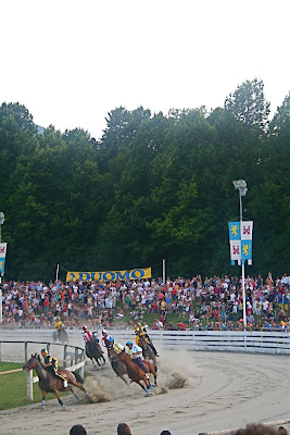 Son ben felice di sapere che i cavalli sono soggetti a rigorosi controlli veterinari, ma nervoso si è subito mostrato uno dei destrieri del quartiere Port’Oria (a Feltre ogni quartiere corre due cavalli, per un totale di otto) e due false partenze non hanno sicuramente migliorato la tensione del momento, per me inclusa che ho quasi sentito bisogno di un veterinario che controllasse a me il polso. La terza partenza senza botto, approvata comunque dal Messere, ha subito visto in testa il cavallo di Duomo seguito dai due destrieri di Castello. Il dorsante ombreggiato dove i due quartieri con meno punti risedevano si è risvegliato in un boato di speranza nuova ed io mi sono sentita compleatamente coinvolta, e parte vibrante di Pra del Moro, il campo dove corrono i cavalli. Sebbene a forza d’uomo le contrade vincenti fin’ora fossero state Santo Stefano e Port’Oria, il fato si è compleatmente rovesciato. Duomo ha mantenuto la corsa fino quasi alla fine, solo per venire clamorosamente superato da Castello, che si è aggiudicato pure il terzo posto, e quindi abbastanza punti per la vittoria finale.