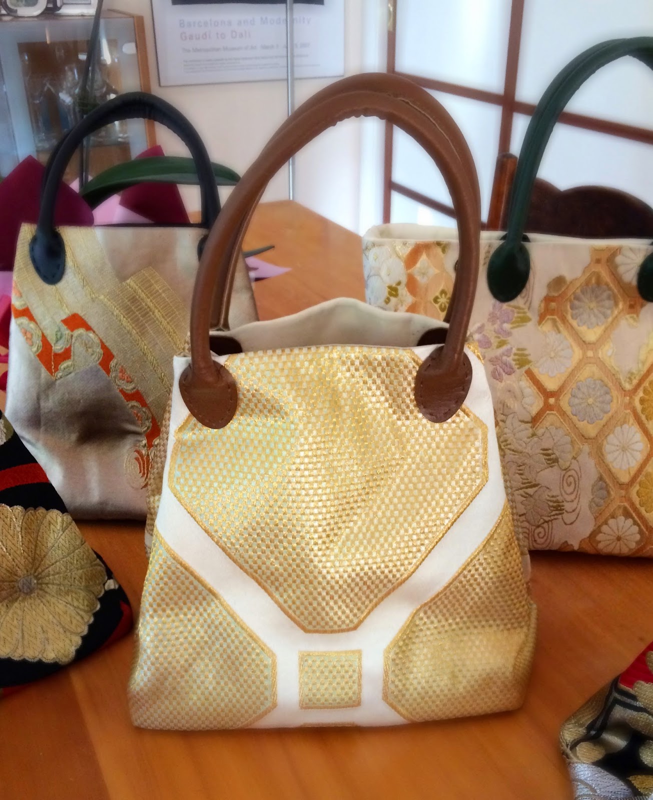 Chizuko, and she presented me with these beautiful cushions (she calls them pillows), plus some table runners. They are all made by hand using kimono and obi (Kimono belts) materials, and you can get them from her cottage industry shop