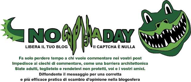 Maybe you were expecting some more Valentine stuff, but no, something different today! I am taking part in the blogging event that aims at removing the "captcha" from the comment forms. No Captcha Day is organized by the Blog of the Alligatore (apparently he is a real alligator, but he can blog) that aims at removing the "captcha" from the comment forms.
