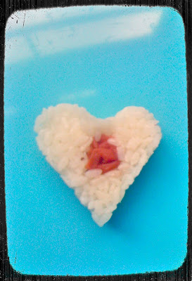 Cook some short grain (not long grain, basmati or Thai) rice by absorption and then start working it when it is still warm. Wet your hands with water, and rub them with just a little salt, then press some rice into a heart shaped cookie cutter. Add something colourful in the centre, I added a umeboshi (Japanese pickled plum), and then gently press the heart out of the mould into a serving plate.