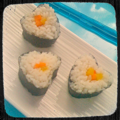 Place a sheet of nori seaweed on a sushi mat, add the rice and the filling, roll and, once you have your sushi roll, pinch the edges to shape it like an heart (this takes time!!!). The most difficult part is to cut the sushi, as you may loose the heart shape, so gently re-touch your sushi pieces with your fingers.
