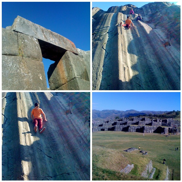 Saksaywaman: elevation 3,701, an Inca fortess in the outskirts of Cusco, easy to reach by taxi, but as it is even higher that Cusco make sure that you have adjusted to the altitude first, and then you can have fun (look at Max sliding!)! From Saksaywaman (which means 'satisfied falcon' and not 'sexy woman') you can look down to Cusco city!