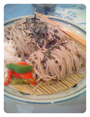 Place your cold and rinsed soba in a soba basket or on your soba plate (lined with the soba mat). If you don't have a soba mat use your sushi rolling mat. Top with nori. Here I put some daikon salad with ume mayo, and sesame capsicums on the side too, they are not traditional, they were just left overs from my Japanese cooking class, but they paired well with the cold soba.