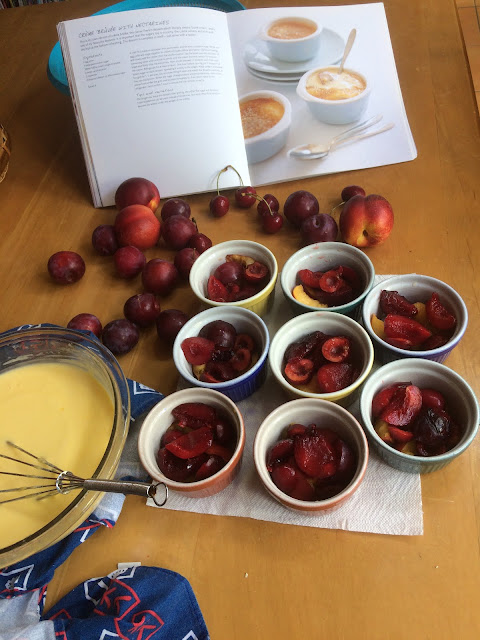 It is up to you how much fruit you put in, generally I just line the bottom of the ramekins with 4-5 think slices, this time I think I overdid it (thus the leftover crème) sicne stone fruit season is not long in NZ, and I wanted to use more fruit than crème! Don't use watery fruit and remove any juice from from cutting: you don't want to have a soggy base!