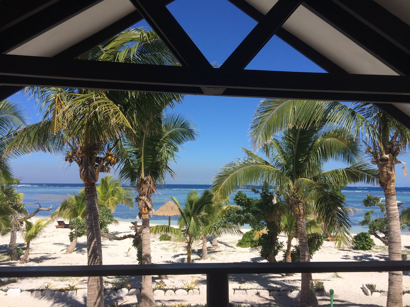From top right, clockwise: blue skies, Arantxa in crystal clear water, On Fiji Island by Ronald Right was published in 1987 but it is great reading, my legs getting tanned!